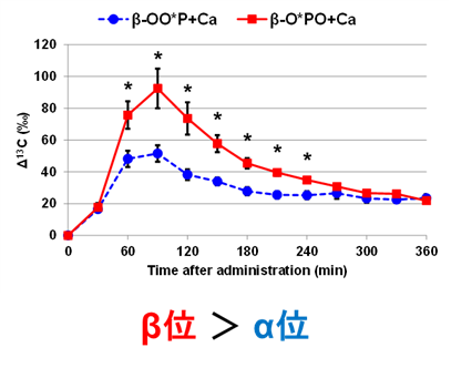 当研究室では、安定同位体13C で標識した脂肪酸を特定の sn-位置に結合させた TAG を化学合成し、マウス呼気中の 13CO₂ を測定することで、その脂肪酸がどれだけ“燃焼されたか(β酸化されたか)”を定量解析する方法を確立しました(図1)。