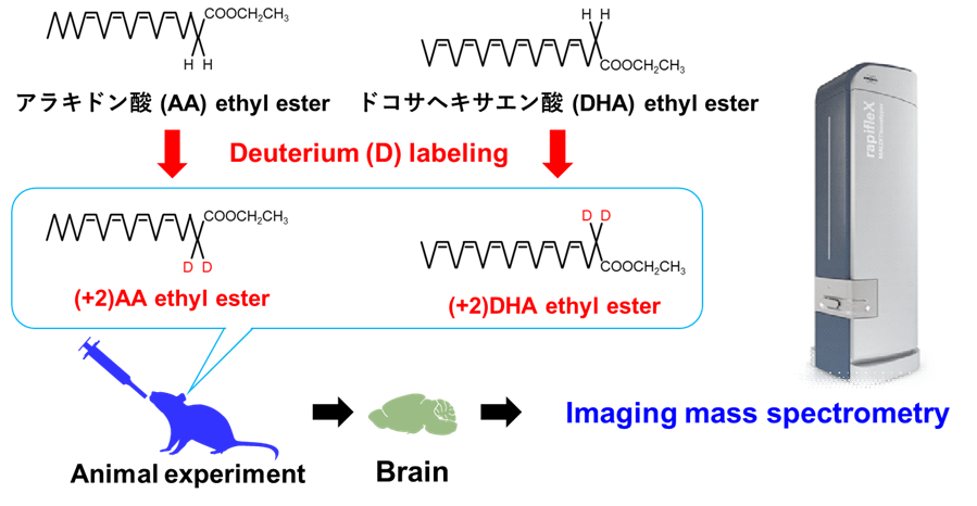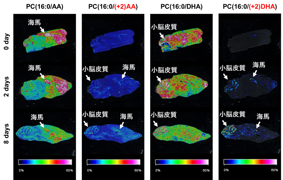 図4 安定同位体ラベル化多価不飽和脂肪酸を投与したマウス脳のイメージング画像