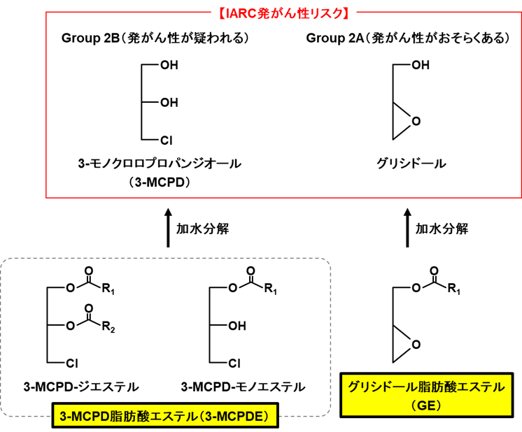 特に重要なのは、3-MCPDE やGEが体内で加水分解されると、発がん性が指摘されている「3-モノクロロプロパンジオール(3-MCPD)」や「グリシドール」を生成するという点です(図1)。