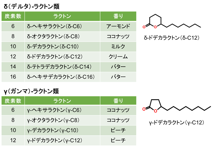 乳脂肪の芳醇な香りは、δ-デカラクトン、δ-ドデカラクトン、δ-テトラデカラクトン、δ-ヘキサデカラクトン、γ-ドデカラクトンが主に寄与。【公開論文】