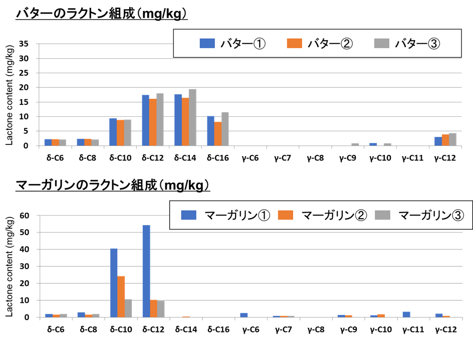 マーガリンはメーカーによりラクトン組成が大きく異なる。⇒ 香料の使用が示唆。【公開論文】