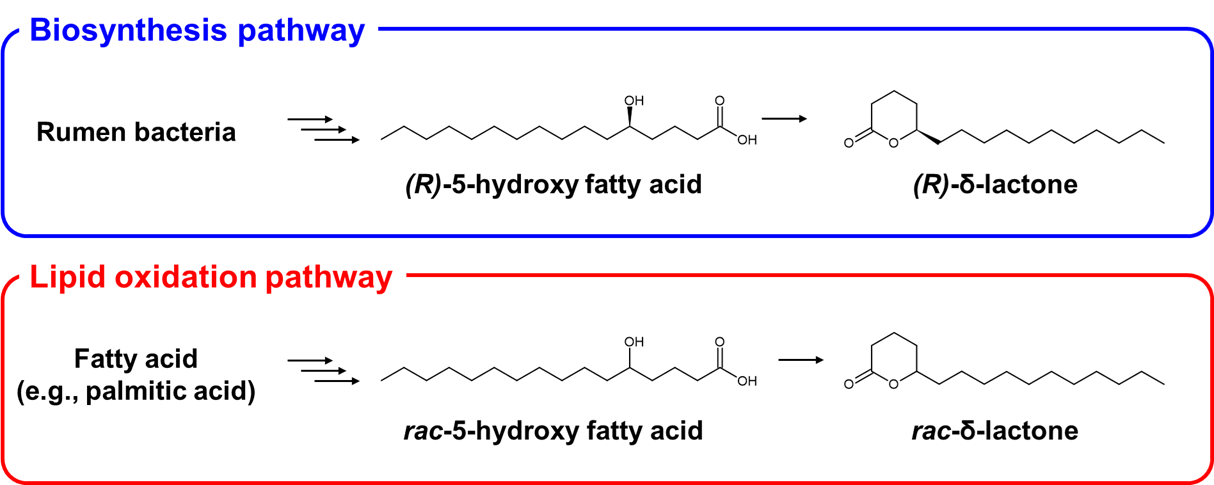 ラクトンは、反芻動物の第一胃(ルーメン)に存在する細菌によって産生されるヒドロキシ脂肪酸(ラクトン前駆体)が環化することで生成します。