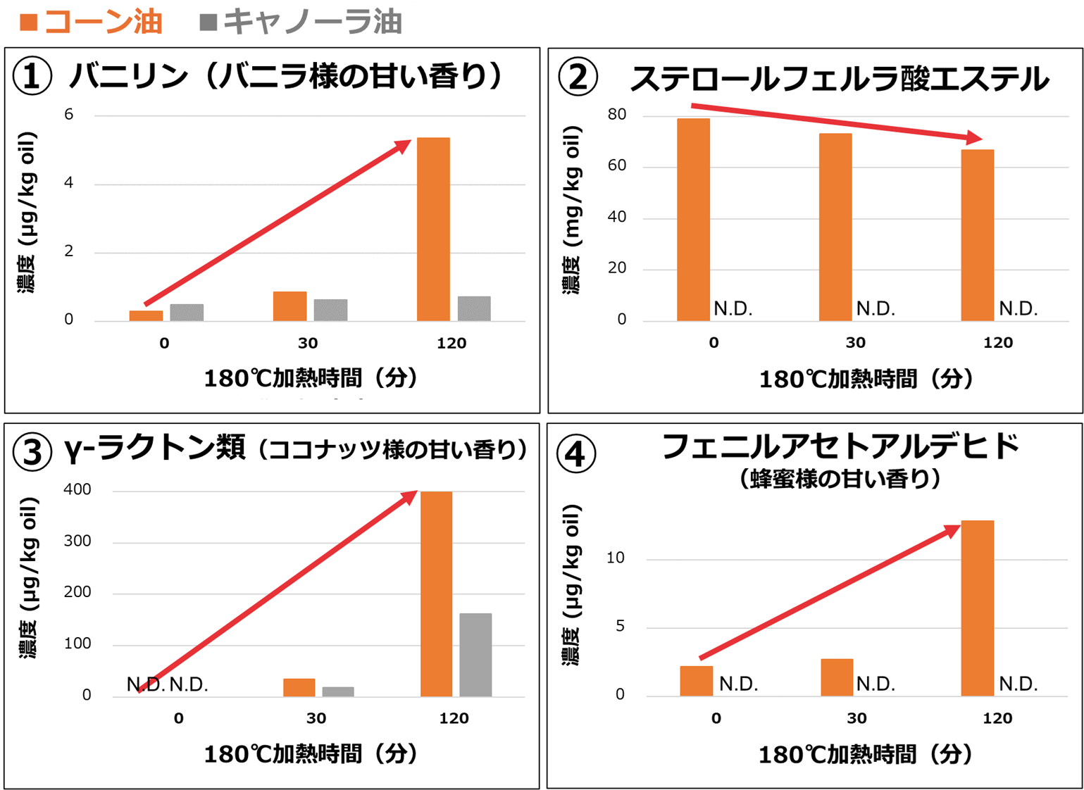コーン油の SAFE 抽出物を GC–MSで解析した結果、以下の成分が コーン油特有の甘い香りを形成していることが明らかになりました(図5)。【プレスリリース】